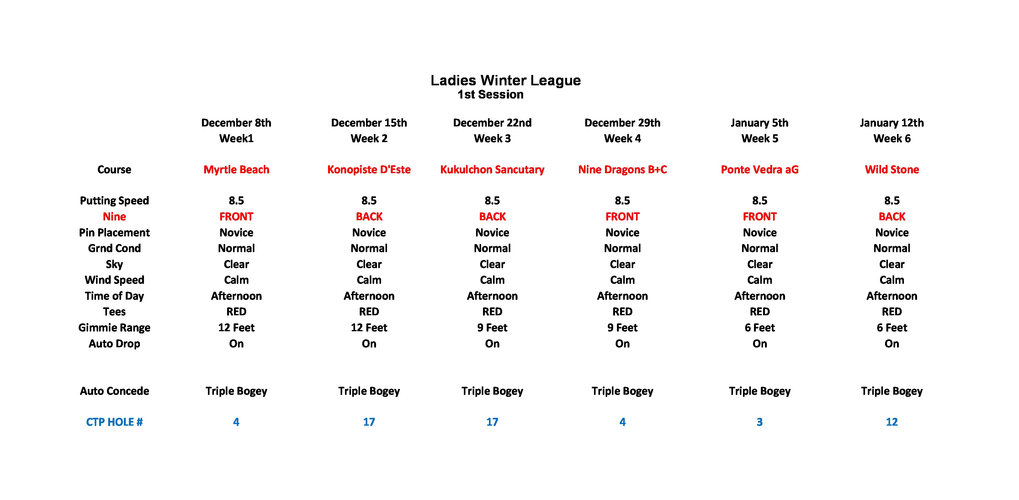2-Lady Team, best ball gross and net (optional cash games each week!)